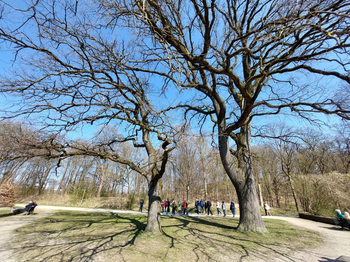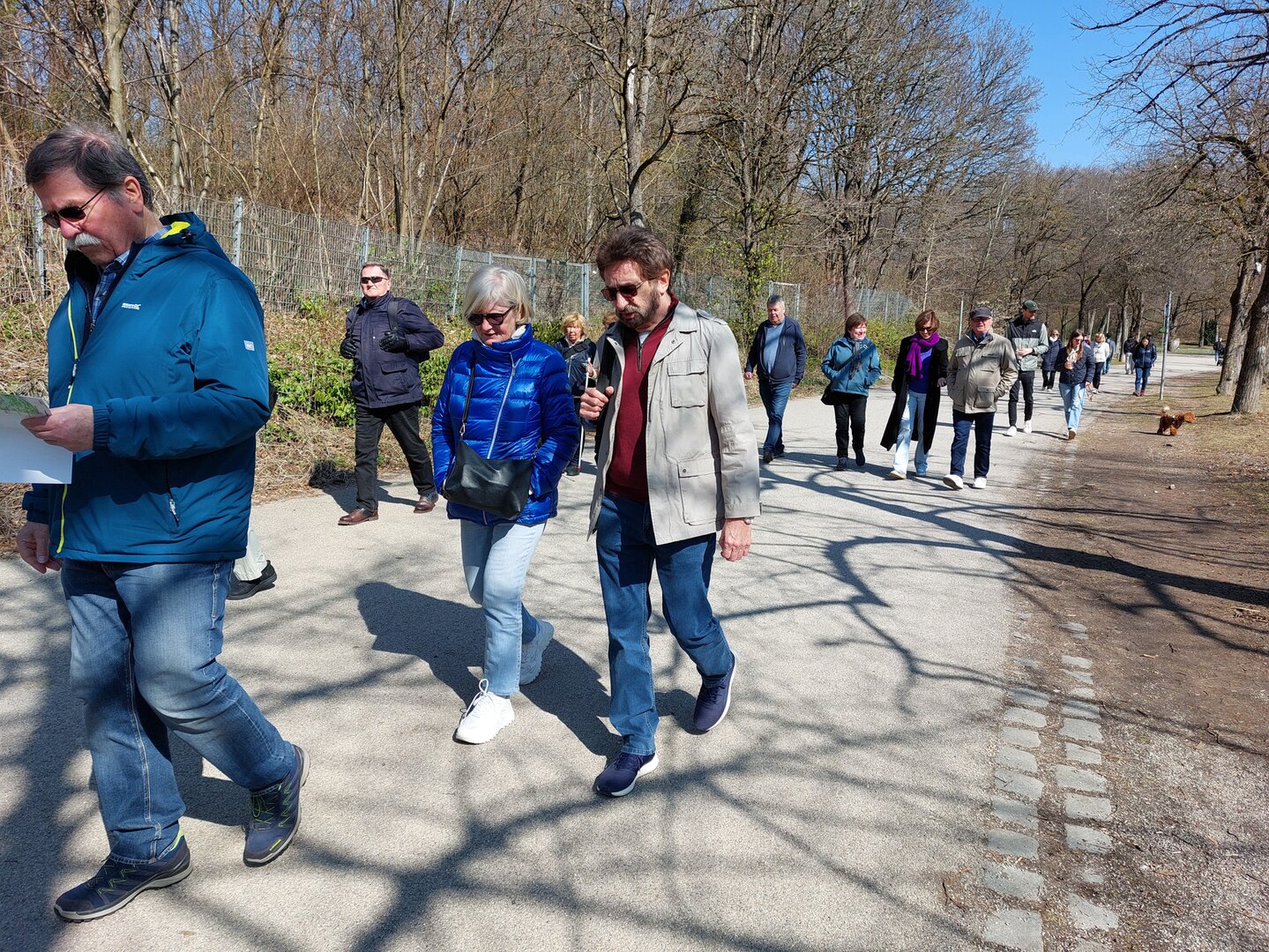 Ausgangspunkt der Wanderung war der BMW Park, vielen noch bekannt als ehemalige Rudi-Sedlmayer-Halle. Von dort aus führte die Route vorbei am idyllischen Griechischen Garten und den imposanten Alten Eichen. Nach der Überquerung der vielbefahrenen Garmischer Autobahn eröffnete sich der Gruppe bereits das nächste Highlight: das Bayerwaldhaus, das einst Teil des Museumsdorfes in Tittling war und im Zuge der Parkgestaltung nach München umgesetzt wurde.