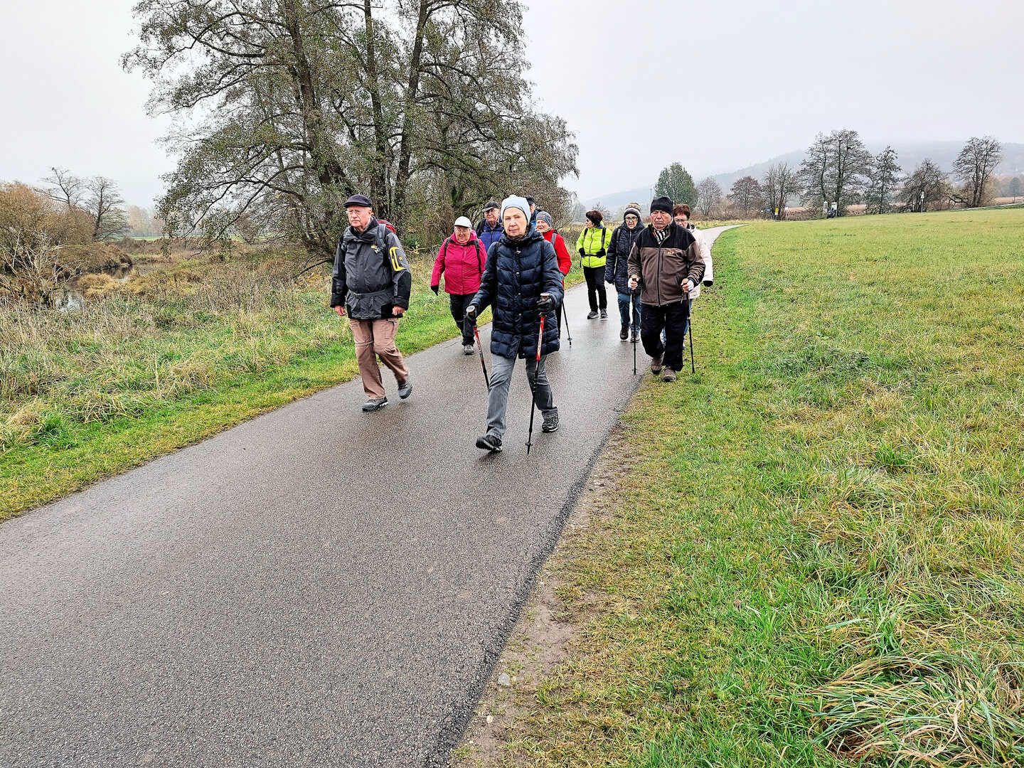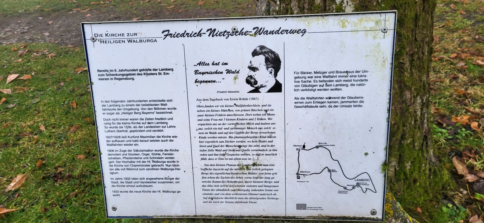 Zur vorletzten Wanderung 2025 konnten die beiden Wanderführer Otto Albertskirchinger und Ernst Stern 53 Teilnehmer begrüßen. Gemeinsames Ziel war zunächst die als „Urkirche des Oberen Bayerischen Waldes“ bezeichnete Kirche in Chammünster. Unser Ehrenvorsitzender und Historiker Werner Schäfer, der extra nach Chammünster gekommen war, blickte in seinem Vortrag auf die fast 1300- jährige Geschichte dieses Gotteshauses und seiner Umgebung zurück. Nach dem Kirchenbesuch trennte man sich in 2 Gruppen. Die A- Gruppe wanderte, auf dem Friedrich Nietzsche gewidmeten Weg, zum Lamberg. Der Philosoph war im Jahr 1867 zu Gast in Cham und war mit seinem Freund Erwin Rohde auf den 602 m hohen Berg gewandert. Auf dem Gipfel steht eine der Hl. Walburga geweihte Wallfahrtskirche. Nach einem kurzen Besuch, die Aussicht die man normalerweise von hier oben hat, war buchstäblich im Nebelgrau versunken, machte man sich auf den Rückweg nach Chammünster. Die B- Gruppe wanderte durch die herbstliche Regen- und Chambaue nach Windischbergerdorf. Einen schönen Ausblick auf die Flusslandschaft von Regen und Chamb und auf die Stadt Cham bot sich den Teilnehmern an der sogenannten „Weißen Brücke“. Sie verbindet Chammünster mit dem Chamer Stadtteil Altenstadt und ist somit eine wichtige Verbindung für Fußgänger und Radfahrer. Nach der Wanderung brachte der Bus dann beide Gruppen zur Einkehr nach Schlammering ins Gasthaus Bucher. Bei vorzüglicher Bewirtung klang der schöne Nachmittag aus.